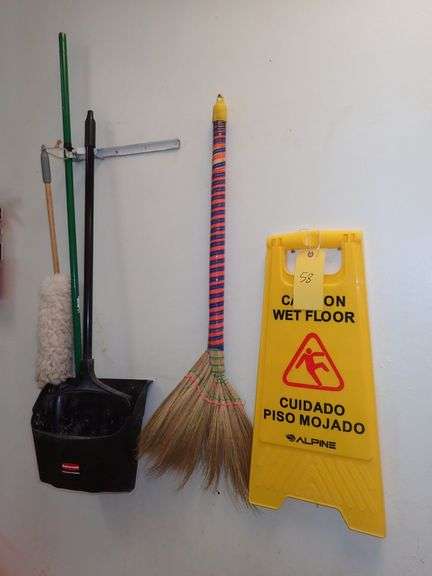 ASSORTED JANITORIAL / FABRIC SOFTENER SUPPLY - INCLUDES: (2) BROOMS, (1) DUST BIN, (1) DUSTER, (2) WET FLOOR STANDS, AND FABRIC SOFTENER JUGS, (2) STAINLESS STEEL TRASH BINS, (1) 33 GALLON TRASH BIN