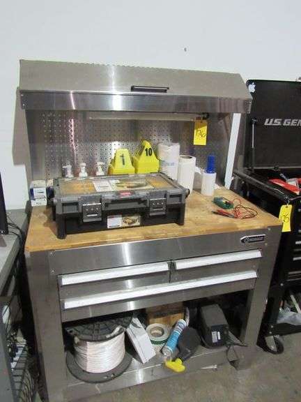 KOBALT STAINLESS STEEL WORK BENCH WITH 3-DRAWERS, LIGHTED - APPROX. 45" X 24" X 64", SOLD WITH CONTENTS AS SHOWN