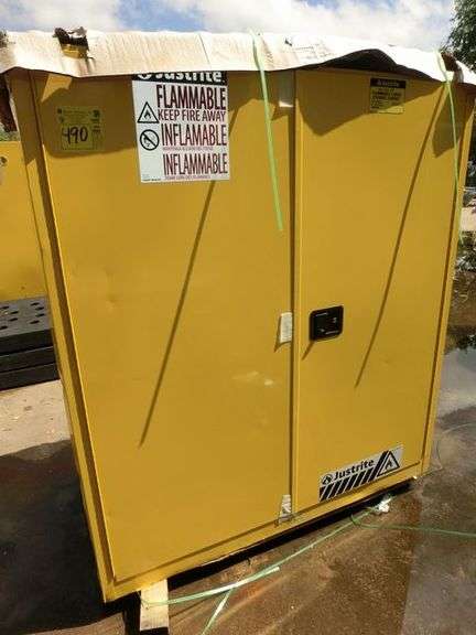 JUSTRITE SURE GRIP EX FLAMMABE LIQUIDE CABINET WITH SHELVED AS SHOWN 899160, 416-LITER CAPICITY, 59" X 34" X 65" *DAMAGED AS SHOWN*