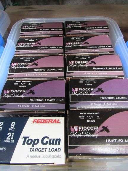 (1) PLASTIC BIN WITH (20) BOXES OF AMMO INCLUDING 12 GAUGE SHELLS, FEDERAL, FIOCCHI AND WINCHESTER *PLEASE NOTE - SOME BOXES MAY BE INCOMPLETE*