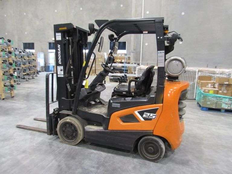 2021 DOOSAN FORKLIFT, TRIPLE MAST #DR70000182 MDL GC25S-9 S/N FGA1E-1290-01703 189" LIFT HEIGHT, SIDE SHIFT AND TILT 48" FORKS 4,600-LB CAPACITY LP GAS *NO TANK* SOLID TIRES, STARTS AND RUNS **DELAYED PICKUP**