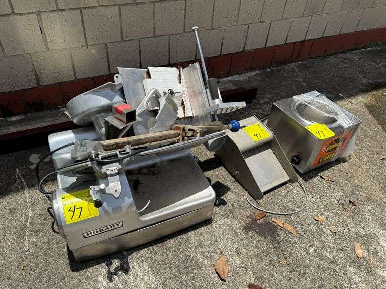 ASSORTED APPLIANCES - INCLUDES: (1) HOBART MEAT SLICER MODEL 1912, (1) TELEQUIP TRANSACT COIN DISPENSER, AND (1) APW / WYOTT SERVICE CHEESE WARMER - NO PUMP AVAILABLE - THESE UNITS HAVE BEEN STORED IN A SHIPPING CONTAINER - WAS TAKEN OUT FOR PHOTOS AND RETURNED TO SHIPPING CONTAINER