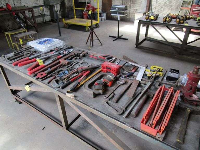 LOT OF ASSORTED HAND TOOLS, PIPE WRENCH, CLAMPS, C-CLAMPS, LIMB BRANCH CUTTERS, TAPE MEASURES, HAMMERS, BOTTLE JACK, MAGNETS, ETC.