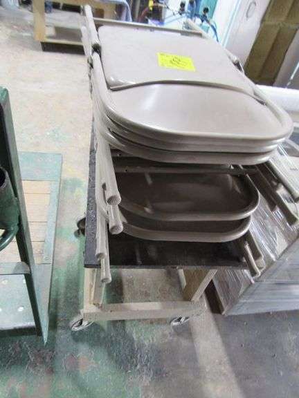 (9) METAL FOLDING CHAIRS ON SHOP MADE WOOD PORTABLE TABLE