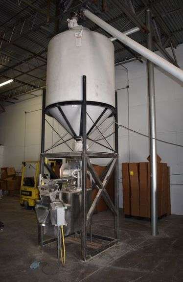 WEIGH PACK MDL-9, LINEAR WEIGH SYSTEM WITH HOPPER FEEDER, LOADING HOPPER AND AN APPROX. 25’ LOADING AUGER PIPE AS SHOWN. THERE IS GRANULAR PRODUCT INSIDE BOTH OF THE HOPPERS