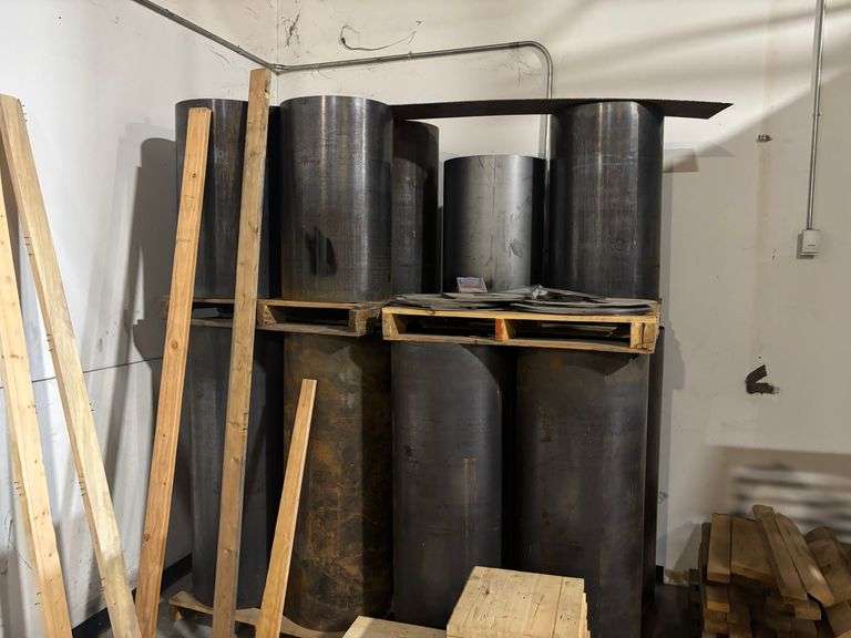 METAL ITEMS AS SHOWN INCLUDING (5) ROLLED CYLINDERS 34” X 20” DIAMETER 14 GAUGE, (8) ROLLED CYLINDERS 52” X 20” DIAMETER 14 GAUGE, (1) ROLLED CYLINDER 26” X 20” DIAMETER 14 GAUGE AND ASSORTED METAL PARTS FOR A SMOKER/GRILL