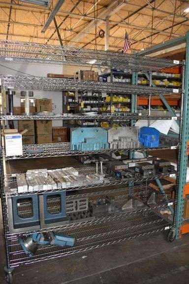 PORTABLE METAL RACK, APPROX. 24" X 72" X 7' HIGH, WITH CONTENTS, ASSORTED MACHINE VISES, FASTENERS, SANDING DISCS, ANGLE BLOCKS, C-CLAMPS AND MORE